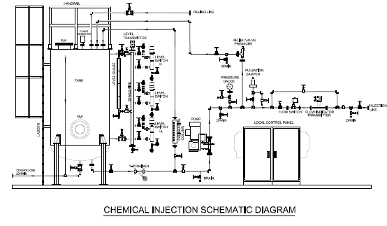 Each chemical injection skid is provided with set of valves and instrumentation depend on the applications. Each skid is provided with level gauge for giving an indication of chemical level inside the tank, level transmitter, calibration pot to calibrate the flowrate, pressure gauge/ transmitter at the suction of dosing pump to detect the low pressure, pressure gauge/ transmitter at the discharge of dosing pump, pressure relief valve to protect the piping from over pressurization, check valves to protect the system from the back flow, flowmeter to measure the injection flowrates and any other accessories as per the clients requirements.