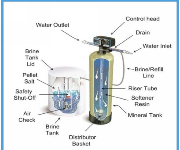 Water Softening Plants: is the removal of calcium, magnesium, and certain other metal cations in hard water. The resulting soft water is more compatible with soap and extends the lifetime of plumbing. Water softening is usually achieved using ion-exchange resins.Ion exchange resins are organic polymers containing anionic functional groups to which the divalent cations (Ca++) bind more strongly than monovalent cations (Na+).. These minerals are widely used in laundry detergents. Resins are also available to remove carbonate, bi-carbonate and sulphate ions which are absorbed and hydroxide ions released from the resin.When all the available Na+ ions have been replaced with calcium or magnesium ions, the resin must be re-charged by eluting the Ca2+ and Mg2+ ions using a solution of sodium chloride or sodium hydroxide depending on the type of resin used.For anionic resins, regeneration typically uses a solution of sodium hydroxide or potassium hydroxide. The waste waters eluted from the ion-exchange column containing the unwanted calcium and magnesium salts are typically discharged to the sewage system.