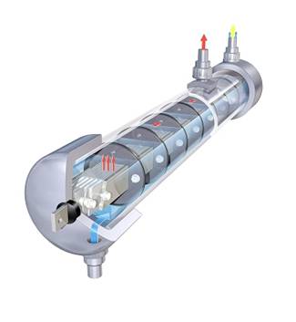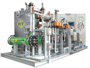 Electro Chlorination: It is a chemical process which uses water, common salt and electricity to produce Sodium Hypochlorite (NaOCl). The brine solution (or sea water) is made to flow through an electrolyser cell, where direct current is passed which leads to Electrolysis. This produces Sodium Hypochlorite instantaneously which is a strong disinfectant. This is then dosed in water in the required concentration to disinfect water, or to prevent Algae Formation and Bio Fouling. The main advantage of electro chlorination is that dangerous chlorine gas can be avoided where brine or sea water is abundantly available.