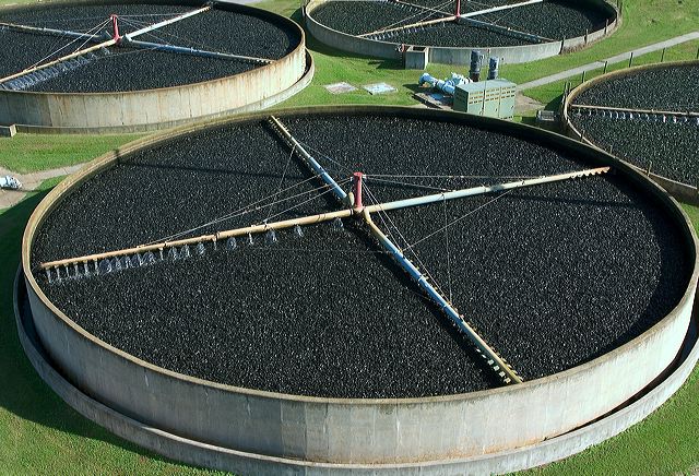 The availability of inexpensive plastic tower packings has led to their use as trickling filter beds in tall towers, some as high as 20 meters. The treated water effluent from industrial wastewater trickling filters is typically processed in a clarifier to remove the sludge that sloughs off the microbial slime layer attached to the trickling filter media as for other trickling filter applications.