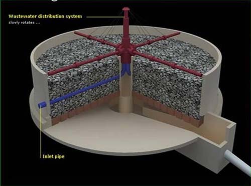 Trickling Filter: It is a type of wastewater treatment. It consists of a fixed bed of rocks, lava, coke, gravel, slag, polyurethane foam, sphagnum peat moss ,ceramic or plastic media over which sewage or other wastewater flows downward and causes a layer of microbial slime (biofilm) to grow, covering the bed of media. Aerobic conditions maintained by splashing, diffusion, and either by forced-air flowing through the bed or natural convection of air if the filter medium is porous.The terms trickle filter, trickling biofilter, biofilter, biological filter and biological trickling filter are often used to refer to a trickling filter. These systems have also been described as roughing filters, intermittent filters, packed media bed filters, alternative septic systems, percolating filters, attached growth processes, and fixed film processes.