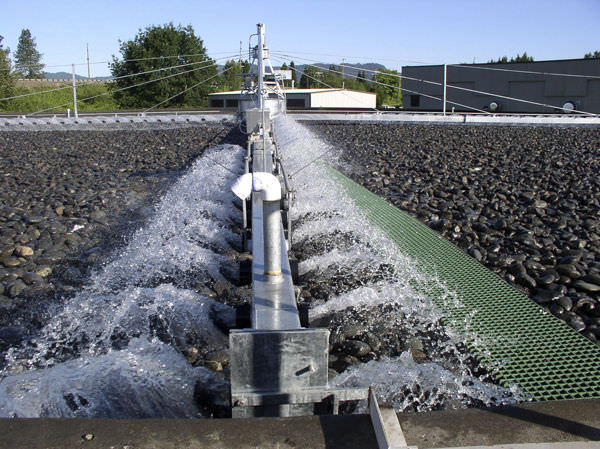 Sewage flow enters at a high level and flows through the primary settlement tank. The supernatant from the tank flows into a dosing device, often a tipping bucket which delivers flow to the arms of the filter. The flush of water flows through the arms and exits through a series of holes pointing at an angle downwards. This propels the arms around distributing the liquid evenly over the surface of the filter media. Most are uncovered (unlike the accompanying diagram) and are freely ventilated to the atmosphere.
